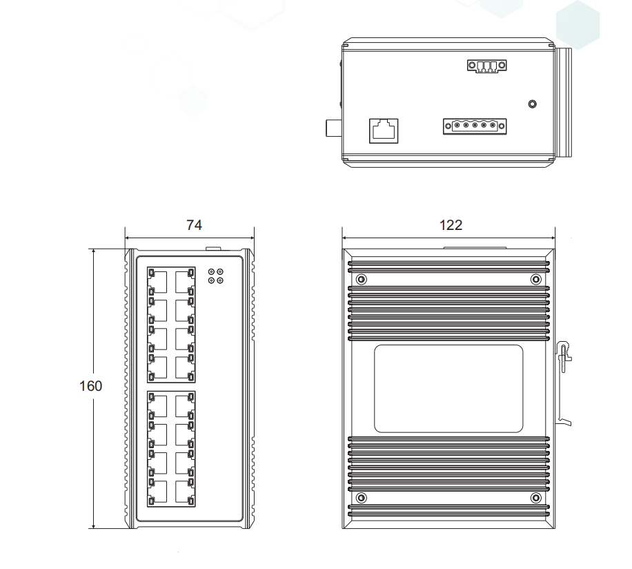 物理尺寸(高×宽×深):160mm×74 mm×122mm 安装方式:标准DIN卡轨式 散热形式:铝合金单肋形机箱表面散热,无风机 机壳防护:IP40 |
