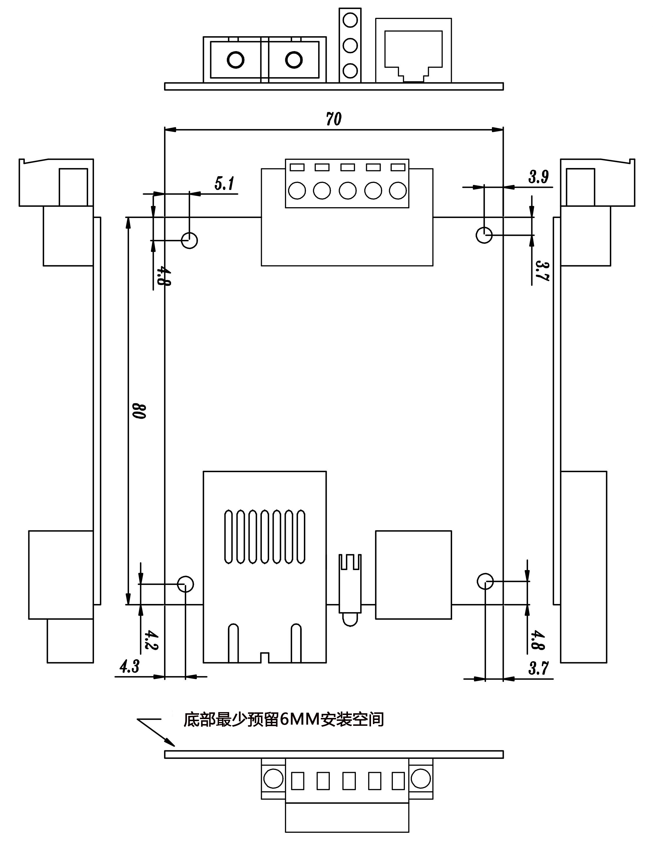 安装方式:嵌入式安装 散热方式:自然冷却,无风扇 外形尺寸:80×70×18(mm)(不含连接器尺寸) |