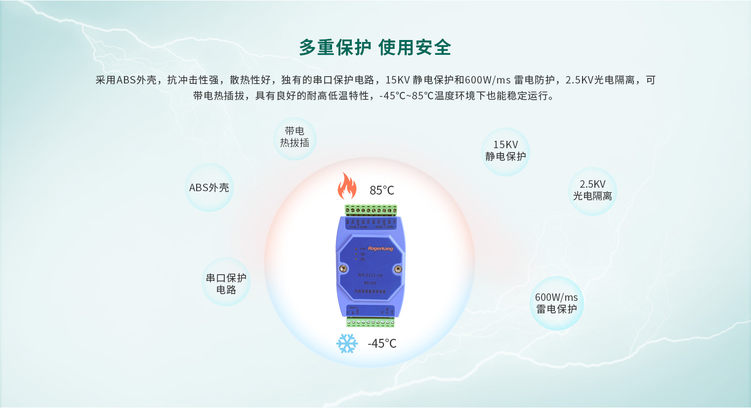 15KV静电保护和600W/ms雷电防护,2.5KV光电隔离 |