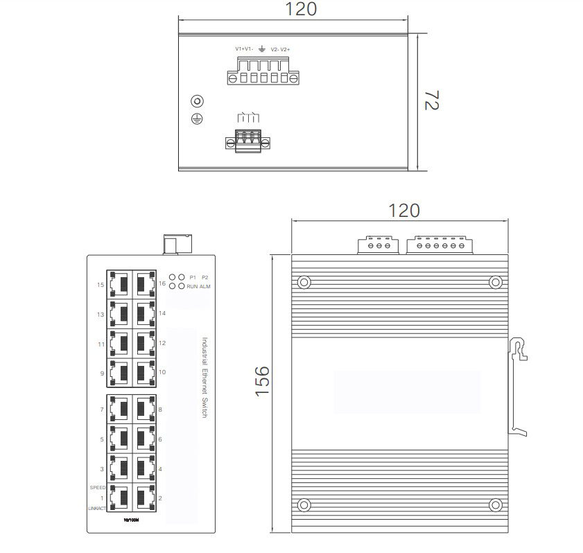 物理尺寸(高×宽×深):160mm×74mm×122mm 安装方式:标准DIN卡轨式 散热形式:铝合金单肋形机箱表面散热,无风机 机壳防护:IP40 |