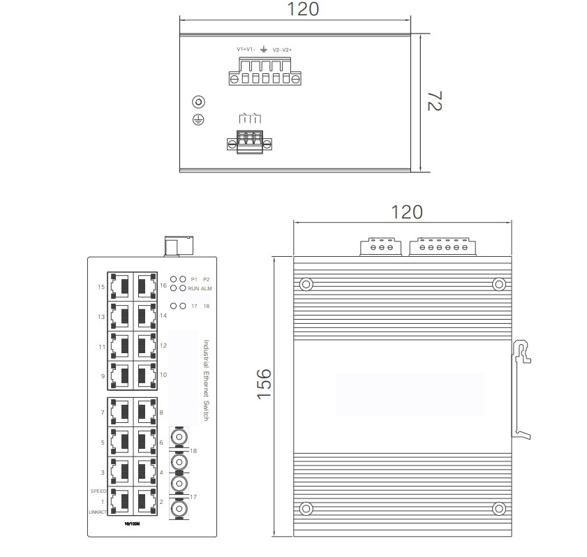 物理尺寸(高×宽×深):160mm×74 mm×122mm 安装方式:标准DIN卡轨式 散热形式:铝合金单肋形机箱表面散热,无风机 机壳防护:IP40 |