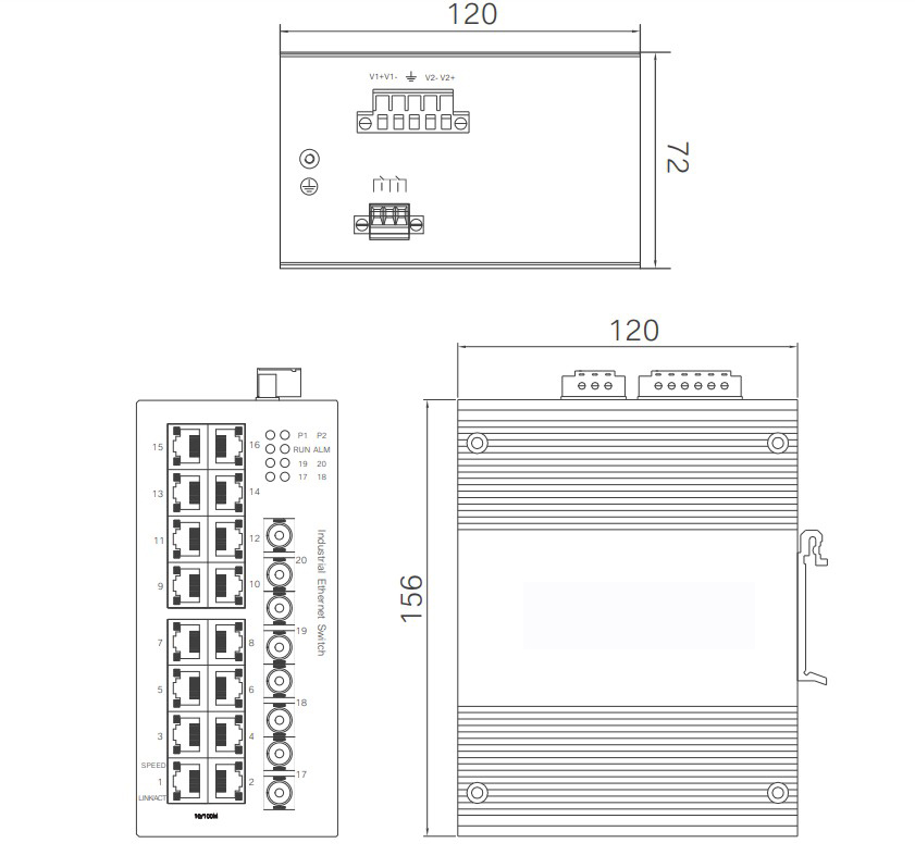 物理尺寸(高×宽×深):160mm×74 mm×122mm 安装方式:标准DIN卡轨式 散热形式:铝合金单肋形机箱表面散热,无风机 机壳防护:IP40 |