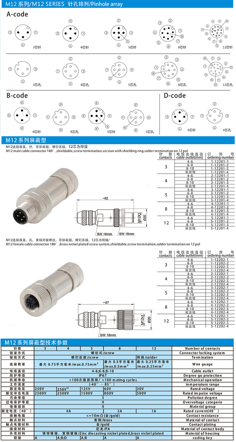 | M12-A-4P-M | M12 A-Coding 4 Pin母头直插型电缆连接器 | 电源口连接器头 | 金属 | IP67防水型 |