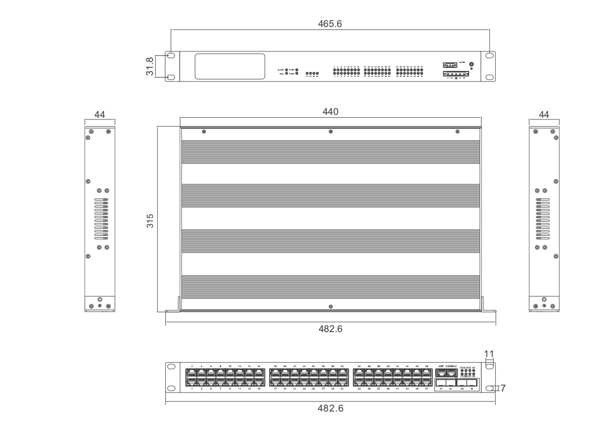 物理尺寸(宽×高×深):482.6mm×44mm×315mm 安装方式:标准19 1U机架式 散热形式:铝合金单肋形机箱表面散热,无风机 出线形式:前后出线 机壳防护:IP40 |