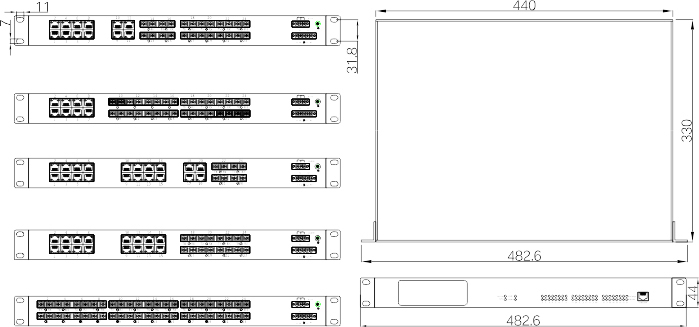物理尺寸(宽×高×深): RS824/T/D/J:482.6mm×44mm×210mm RS824L/P/X:482.6mm×44mm×315mm 安装方式:标准19’ 1U机架式 散热形式:铝合金单肋形机箱表面散热,无风机 出线形式:前后出线 机壳防护:IP40 |
