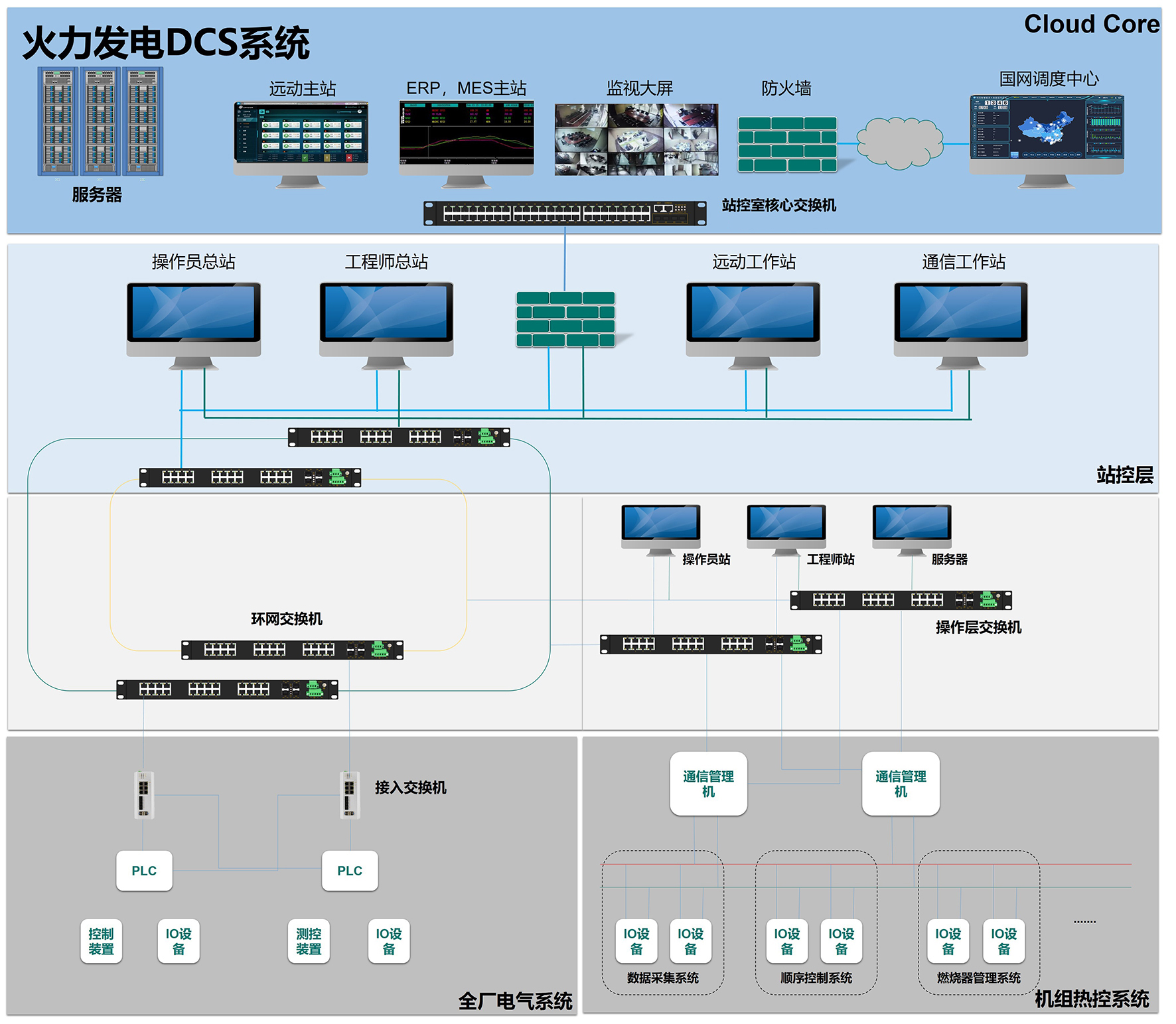DCS系统面向的是各个生产制造行业,因为各个行业有特殊性,因此DCS系统也出现了不同的分支,这个是由厂家的技术设计人员对不同行业的生产制造工艺局限性导致的(例如石化行业、电力行业),DCS应用到发电厂,和通用的DCS系统一样,按电厂运行逻辑根据各种模拟数据量,经过电厂运行的逻辑实现对各种执行部件的控制,这个是一个综合的系统,不光能准确采集各种数据和能够正确发出控制指令时基本功能,关键是对各种数据的分析和判断,这个是电厂提高效率的关键。系统需求